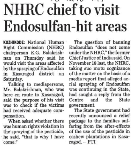 In 2001 the NHRC initiated suo moto action on the report entitled “Spray of Misery” published in India Today (July, 23 2001) and asked a number of agencies including ICMR to submit a report within four weeks. On the directives of the Director General ICMR, a three-member team from NIOH visited the affected areas and collected first hand information and a preliminary report was submitted to the NHRC.