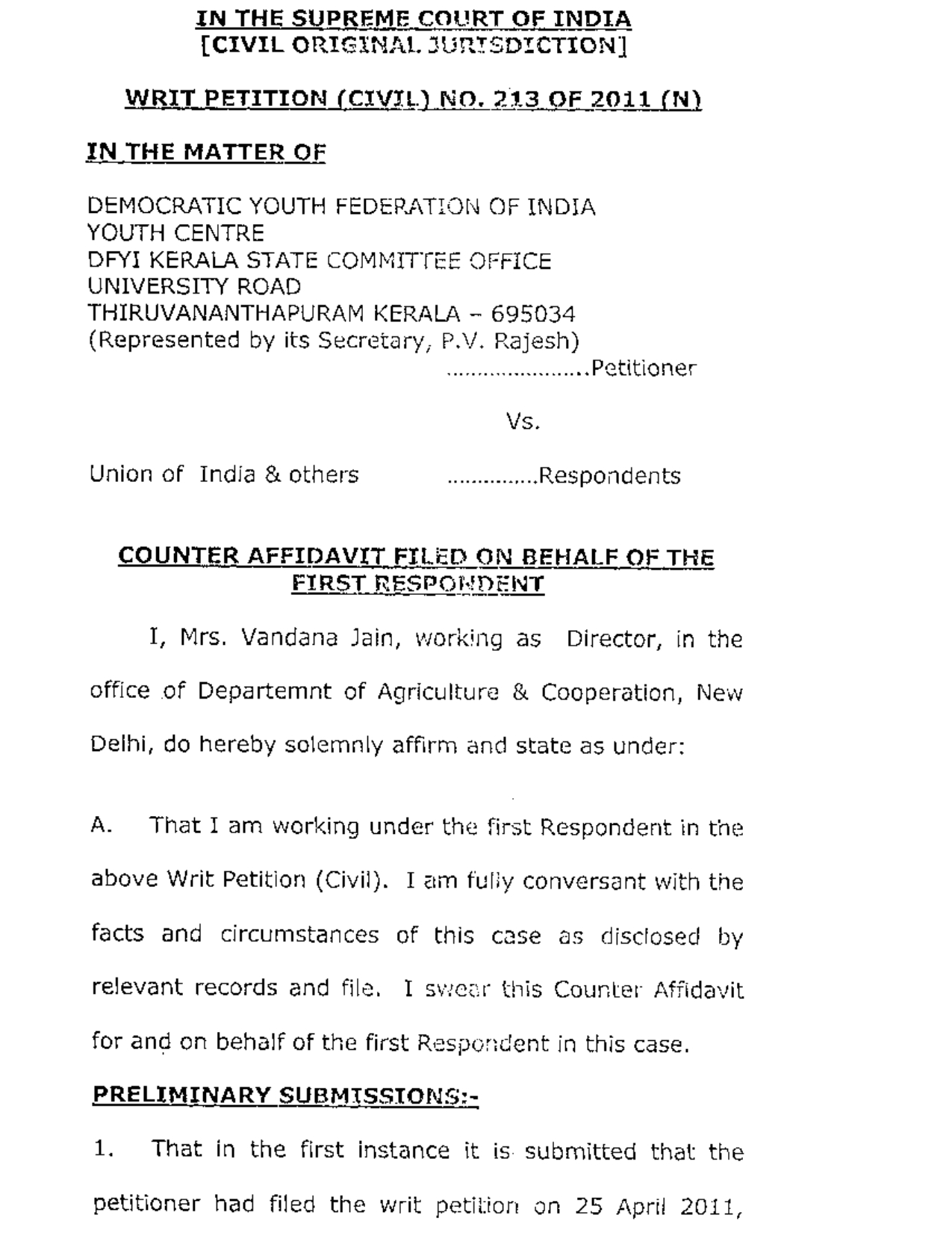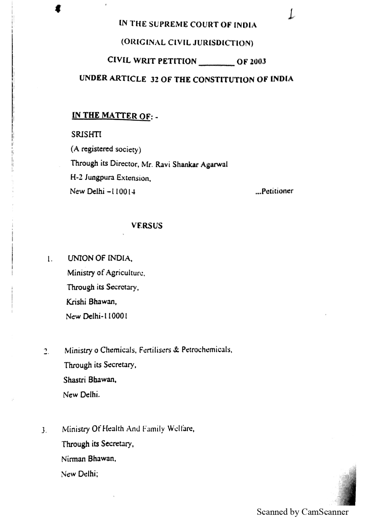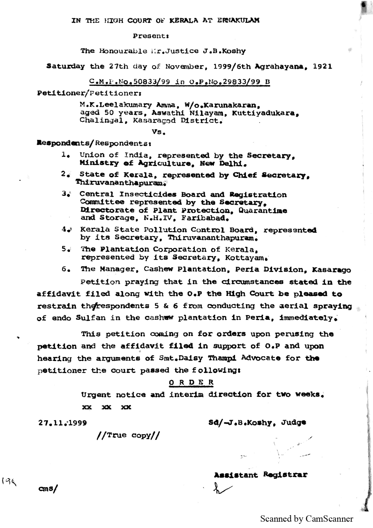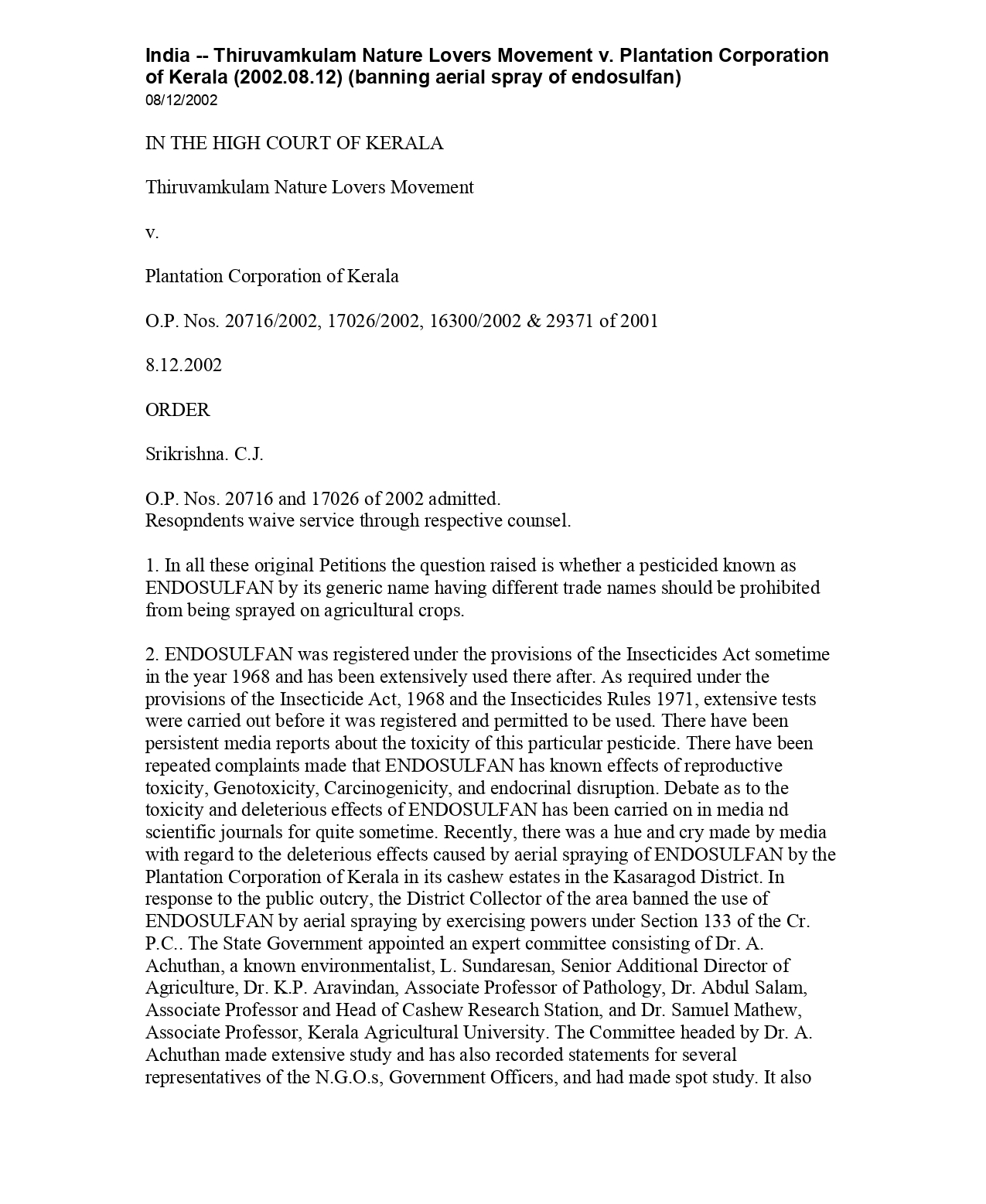 India- Thiruvamkulam Nature Lovers Movement v. Plantation Corporation of Kerala (8.12.2002) (banning aerial spray of Endosulfan)