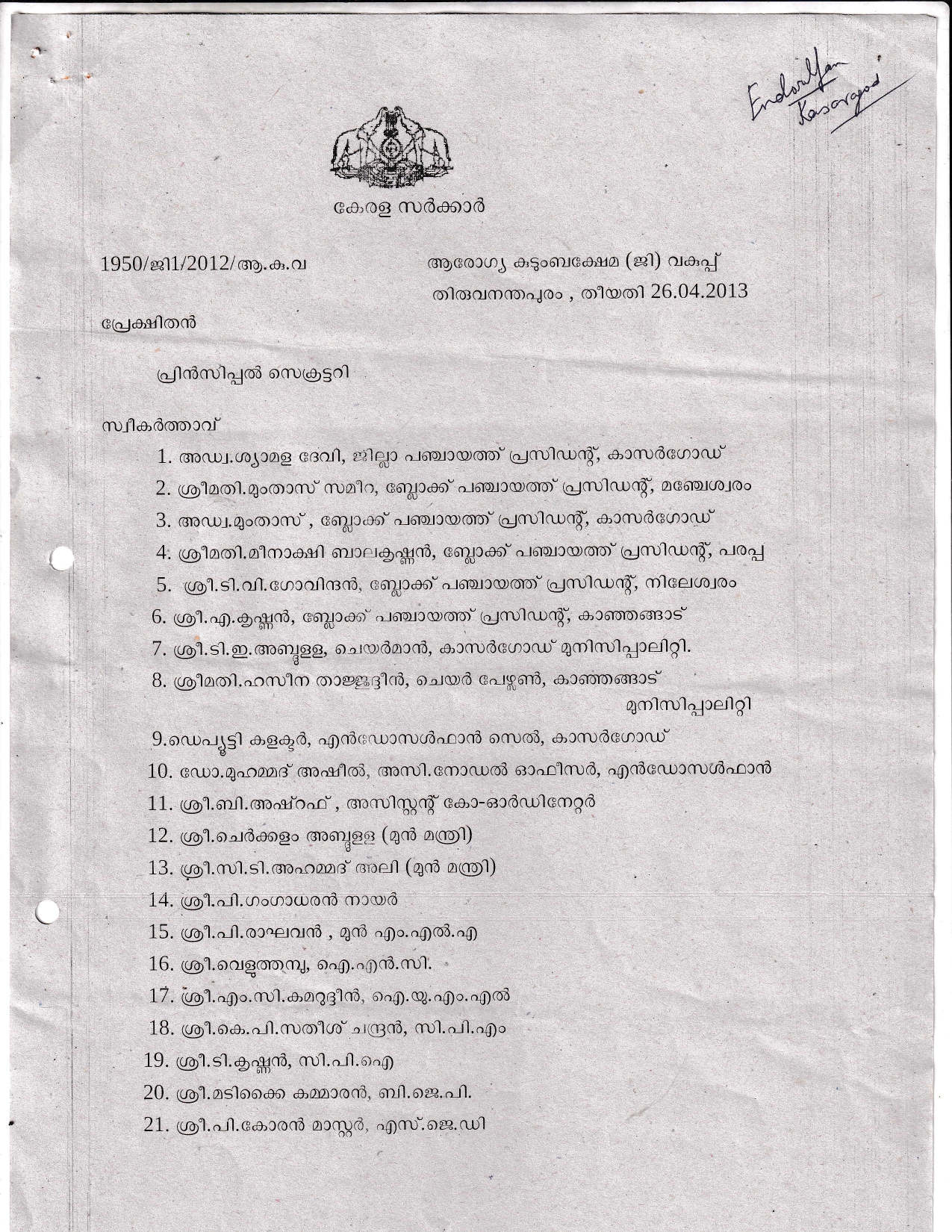 ആരോഗ്യ കുടുംബക്ഷേമ വകുപ്പ് -കാസറഗോഡ് ജില്ലയിലെ എൻഡോസൾഫാൻ ദുരിത നിവാരണ പ്രവർത്തനങ്ങൾ ഏകോകിപ്പിക്കാനും അവലോകനം ചെയ്യുന്നതിനുള്ള ഉത്തരവ്(26/4/2013).