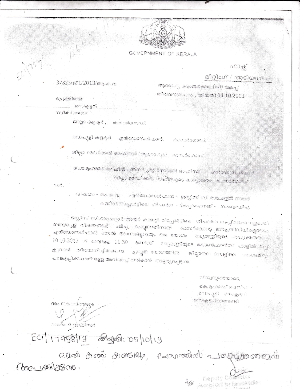 എൻഡോസൾഫാൻ : ജസ്റ്റിസ് സി രാമചന്ദ്രൻ നായർ കമ്മിറ്റി റിപ്പോർട്ടിലെ ശുപാർശ നടപ്പാക്കുന്നത് സംബാധിച്ചിട്ടുള്ള കേരള ഗവണ്മെന്റ്ന്റെ ഓർഡർ(4/10/2013).
