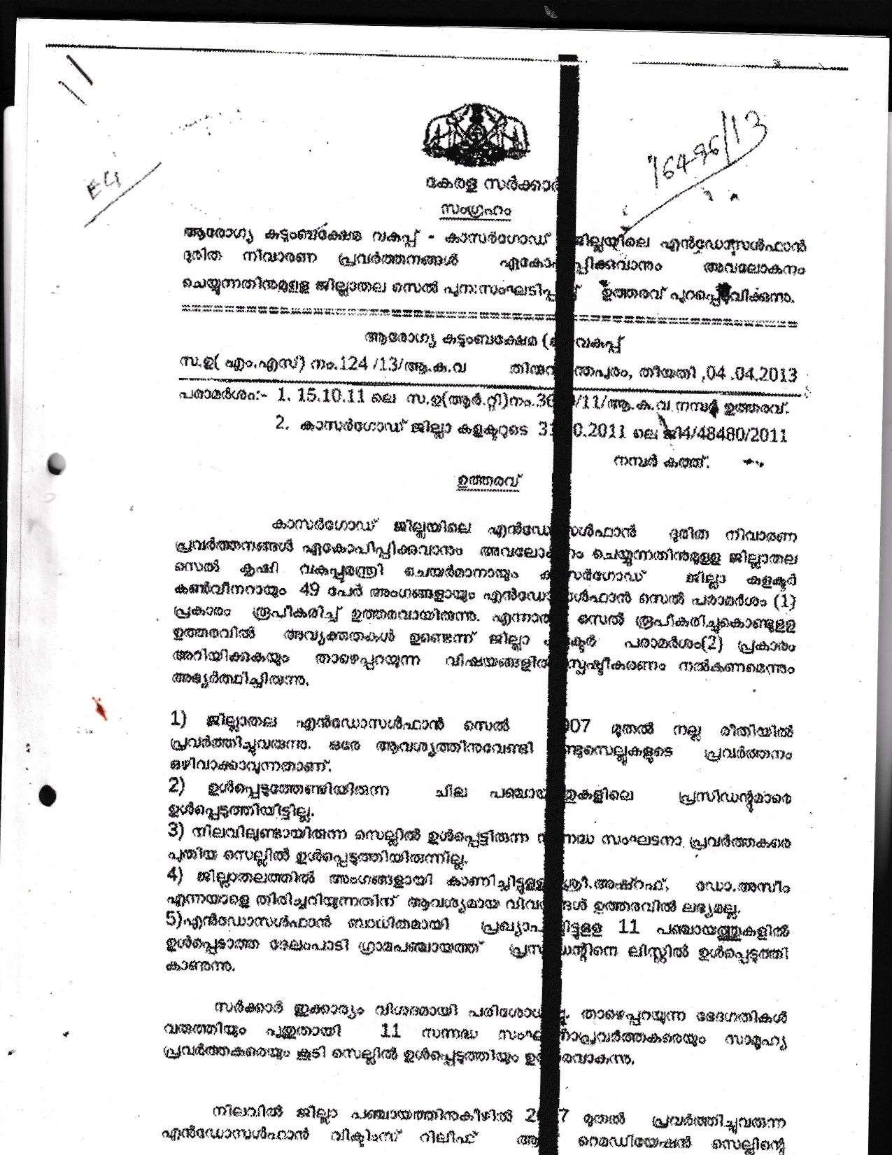 ആരോഗ്യ കുടുംബക്ഷേമ വകുപ്പ് -കാസറഗോഡ് ജില്ലയിലെ എൻഡോസൾഫാൻ ദുരിത നിവാരണ പ്രവർത്തനങ്ങൾ ഏകോകിപ്പിക്കാനും അവലോകനം ചെയ്യുന്നതിനുള്ള ഉത്തരവ്(4/4/2013).