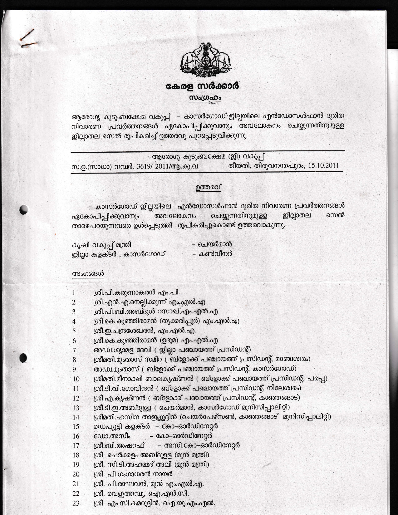 ആരോഗ്യ കുടുംബക്ഷേമ വകുപ്പ് -കാസറഗോഡ് ജില്ലയിലെ എൻഡോസൾഫാൻ ദുരിത നിവാരണ പ്രവർത്തനങ്ങൾ ഏകോകിപ്പിക്കാനും അവലോകനം ചെയ്യുന്നതിനുള്ള ഉത്തരവ്(5/10/2011)