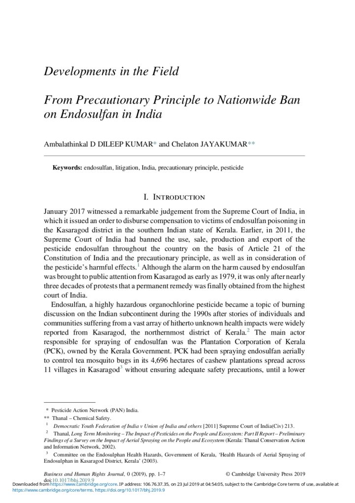 From Precautionary Principle to Nationwide Ban on Endosulfan in India (Cambridge BHRJ 2019)