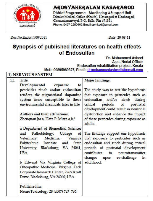 Synopsis of published literature on health effects of Endosulfan